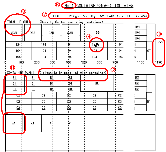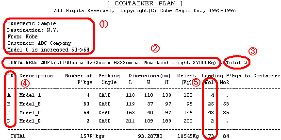 - The total number of the cargoes in the container, total weight, total volume, and the volume efficiency.